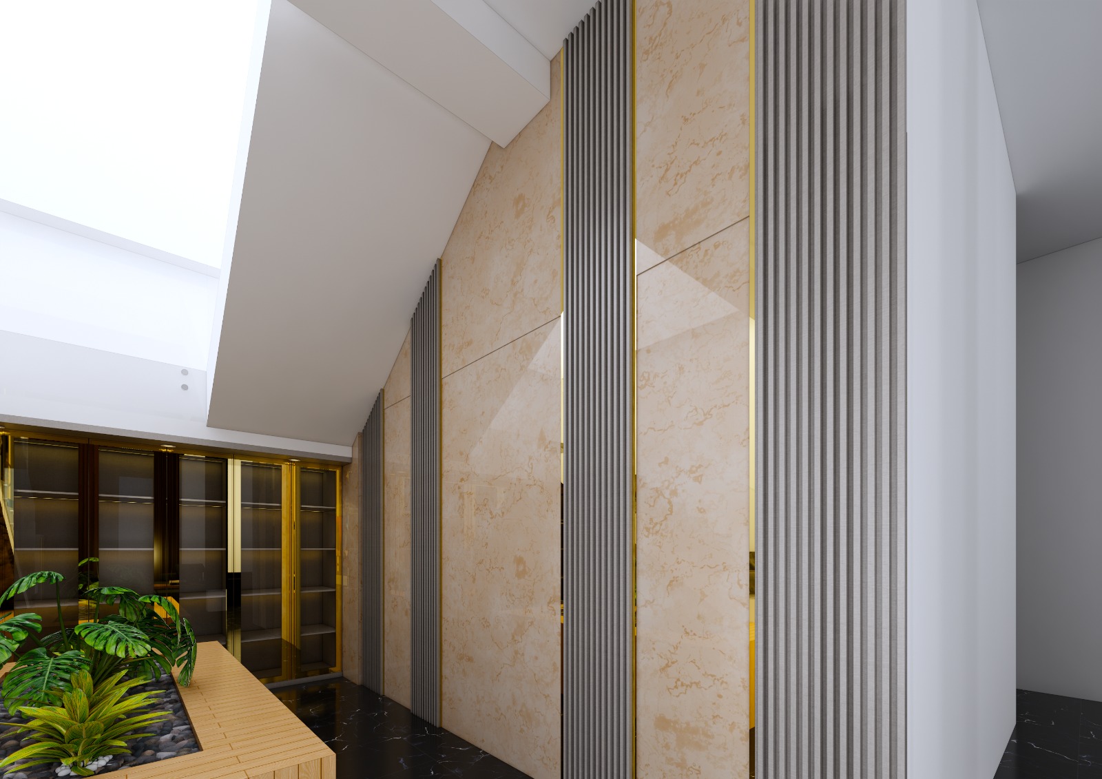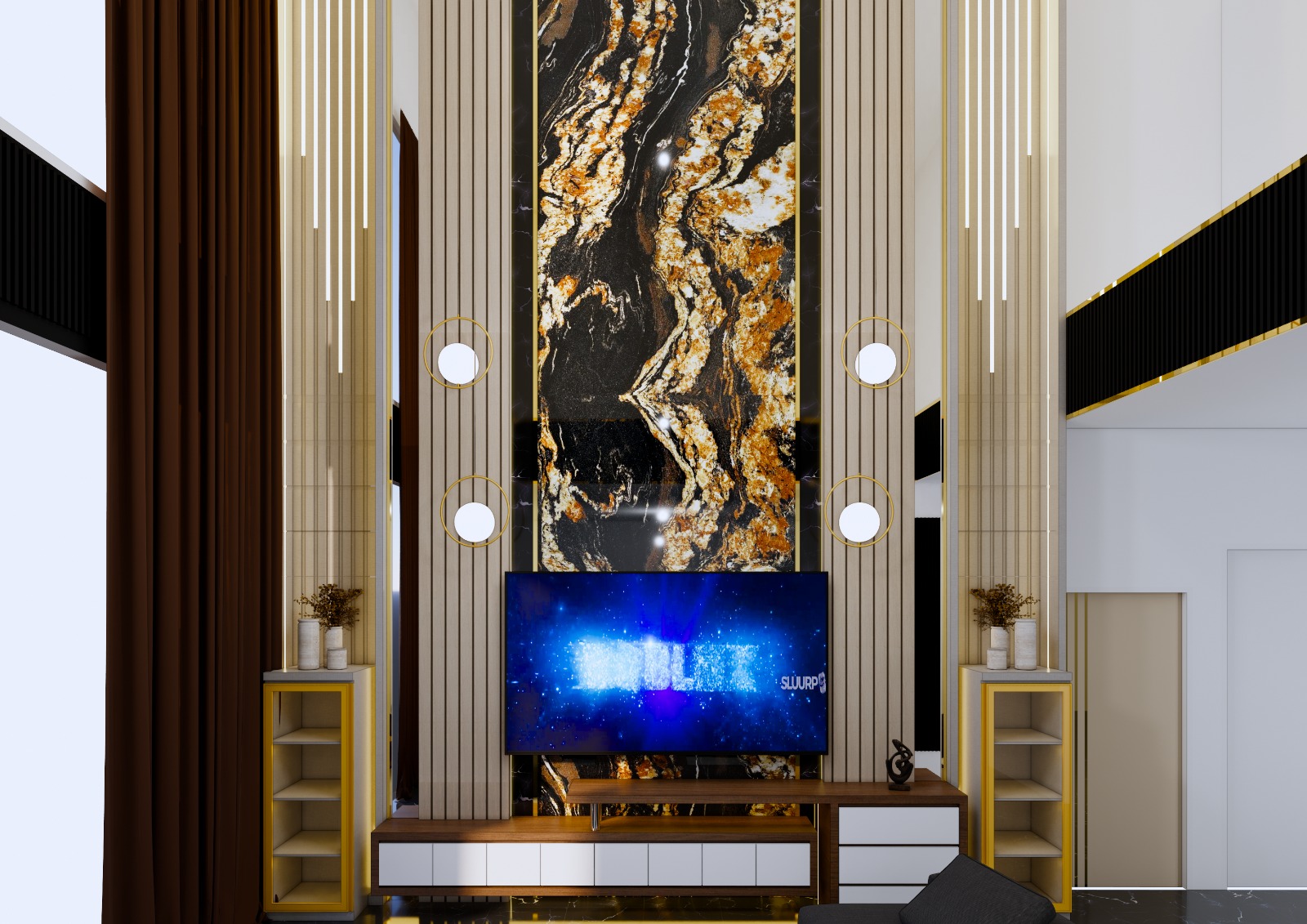 Desain interior ini mengusung konsep modern mewah (luxury modern) yang berfokus pada penggunaan material berkualitas tinggi, pencahayaan dramatis, dan komposisi yang megah. Ruangan ini menampilkan area ruang keluarga/media, area tangga, dan lorong dengan sentuhan glamour