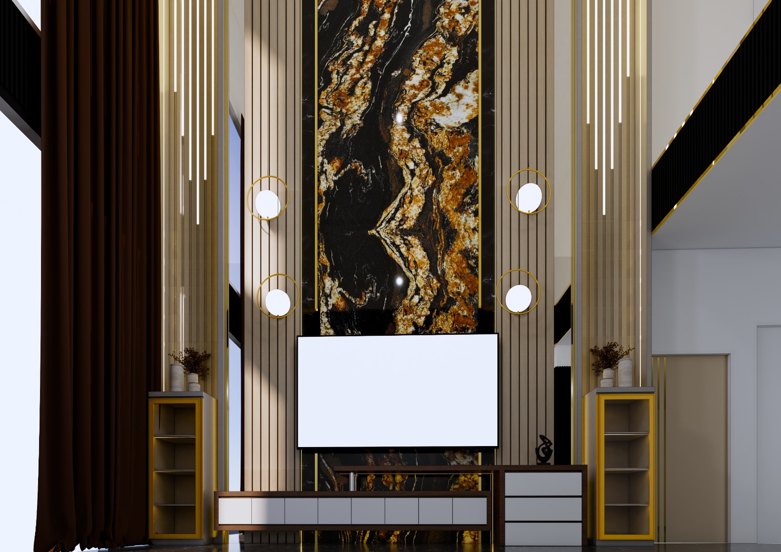 Secara keseluruhan, desain ini berhasil menciptakan sebuah hunian yang sangat megah, modern, dan mewah. Setiap elemen dipilih dengan teliti untuk menghasilkan tampilan yang harmonis dan berkelas, cocok untuk mereka yang menginginkan interior dengan karakter kuat dan berani.