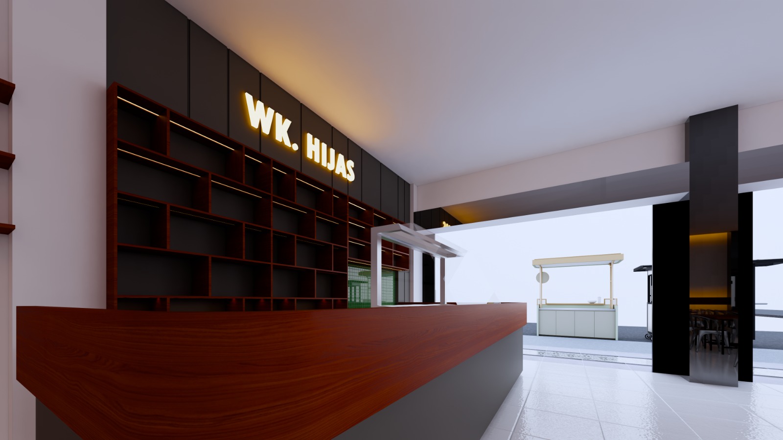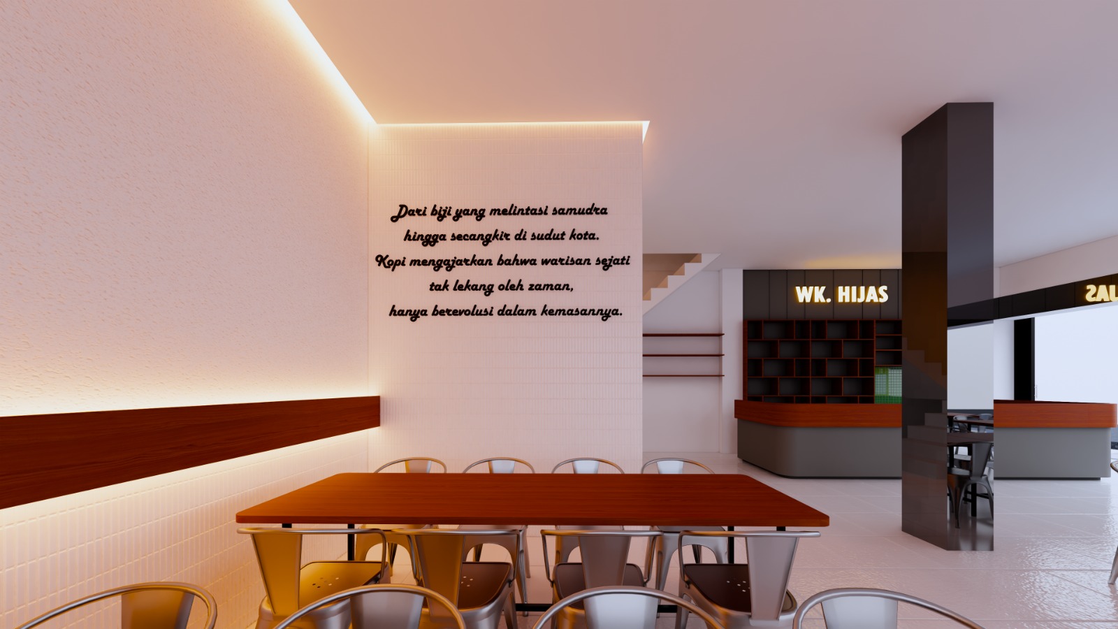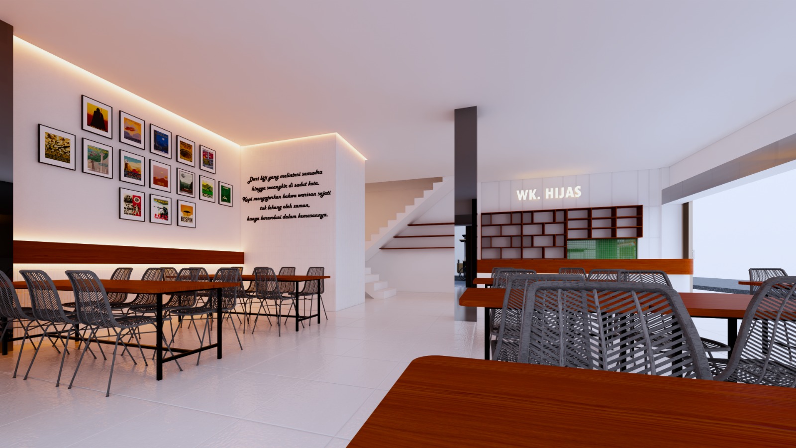 Desain ini berhasil menciptakan sebuah tempat makan yang modern, bersih, dan fungsional. Perpaduan gaya minimalis, industrial, dan sentuhan kayu alami menjadikan “WK. Hijas” tempat yang nyaman dan menarik untuk bersantap atau bersantai.