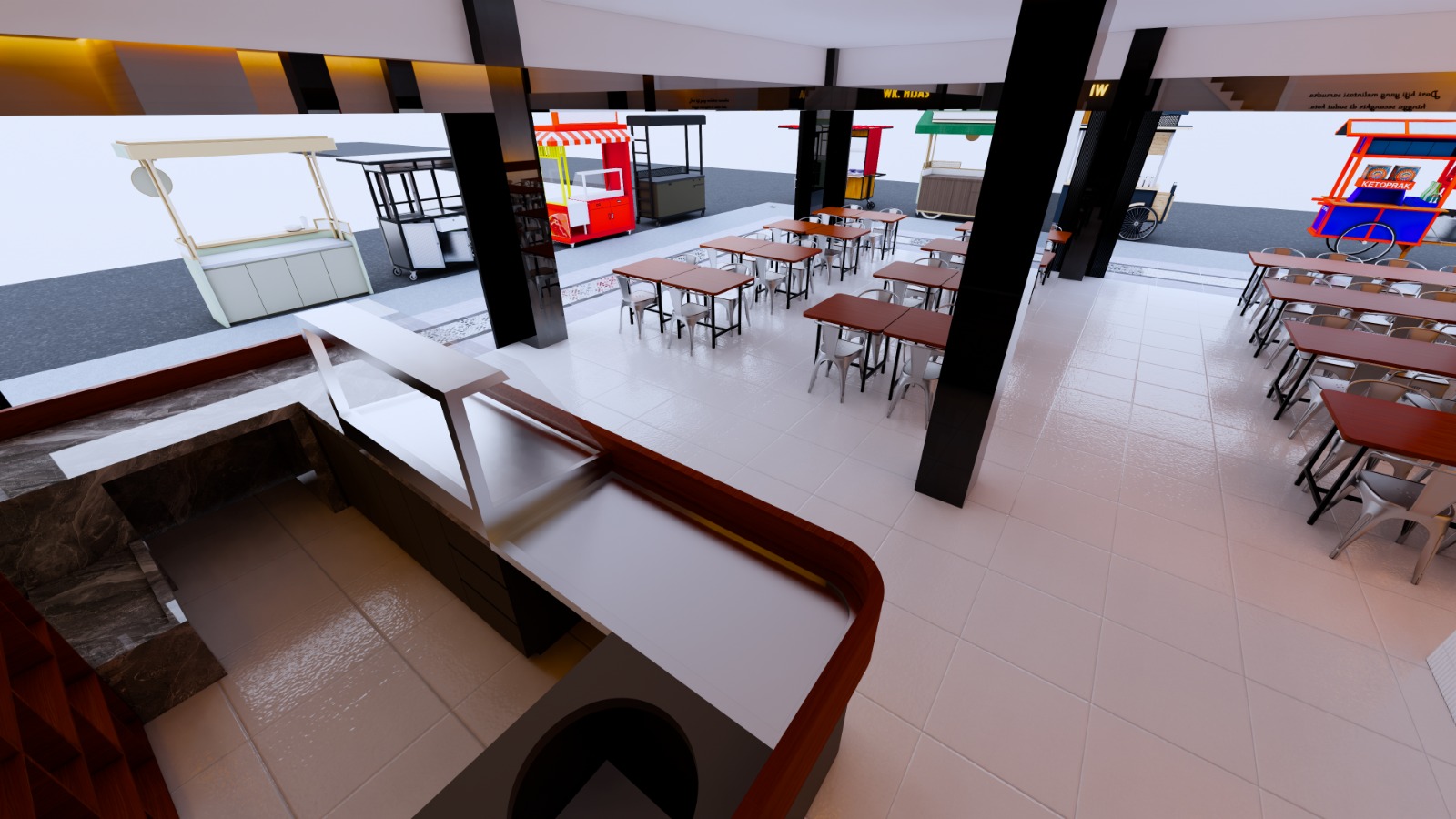 Desain interior ini mengusung konsep kafe atau tempat makan modern minimalis dengan nuansa yang bersih, terorganisir, dan industrial. Ruangan ini dirancang untuk menciptakan suasana yang nyaman dan kasual bagi pengunjung.
